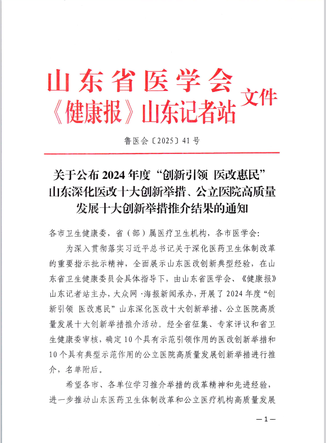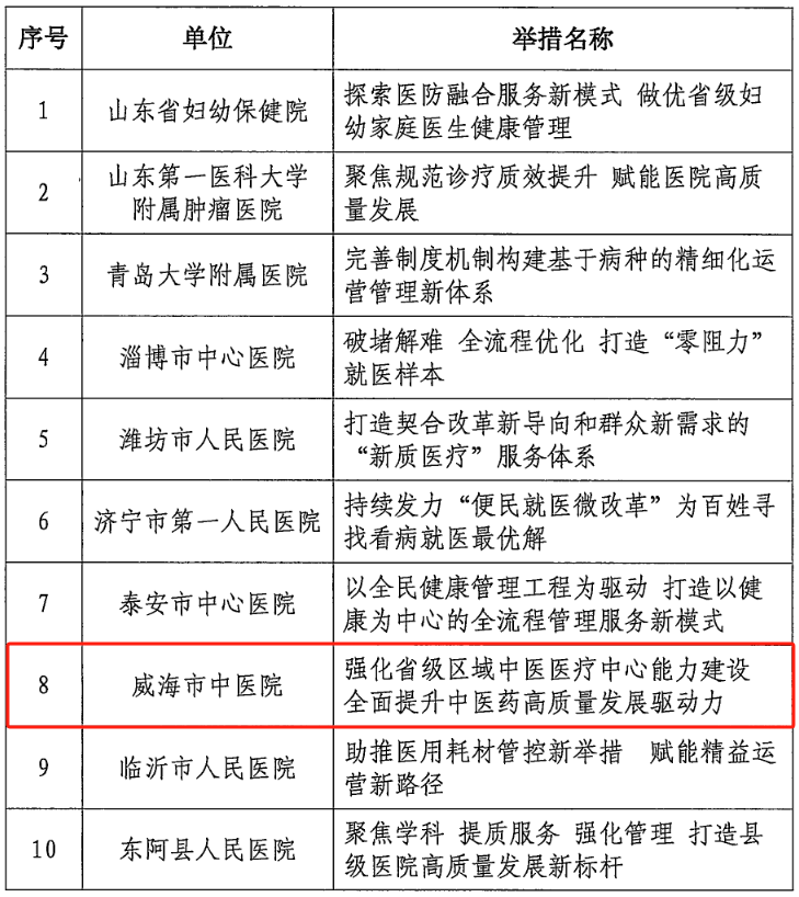据了解,为深入贯彻落实习近平总书记关于深化医药卫生体制改革的重要指示批示精神,全面展示山东医改创新典型经验,我省开展了2024年度“创新引领 医改惠民”山东深化医改十大创新举措、公立医院高质量发展十大创新举措推介活动。经全省征集、专家评议和省卫生健康委审核,威海市中医院实施的《强化省级区域中医医疗中心能力建设全面提升中医药高质量发展驱动力》成为全省10个具有典型示范作用的公立医院高质量发展创新举措之一,被在全省范围内进行推介。